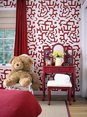 床品、墙纸以及梳妆台基本同一系列的红色,感觉和谐自然。若想让房间换个感觉,摆个大大的公仔,可以立马让它变成可人的闺房,台上随意放上淡色鲜花,也能使房间顿时间鲜活起来!